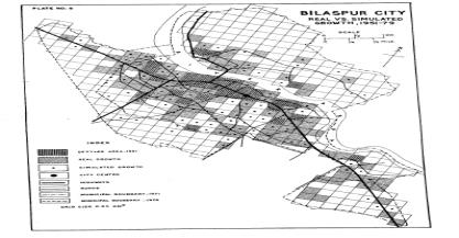 In view of the unique applicability of the Simulation Model to the study of urban growth, the 'Monte Carlo Simulation Model' has been employed to test .the hypothesis regarding the growth of Bilaspur city. The hypothesis was that the city of Bilaspur grew along the State Highway and major city roads, the proximity of city centre, important sub-centers and already settled areas encouraged its expansion; availability of vacant land influenced its growth positively while the area liable to flooding repelled its growth. Thus, axial· or sectoral, as well as the multinuclear growth is seen alon gwith accretion of concentric growth. This test led to the conclusion, that, the hypothesis made above proved to be correct for the majority of cells (about 60%) of simulated growth tallied with these of real growth.